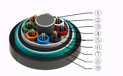 1 光纤、 2 纤膏、 3 松套管、 4 钢丝、 5 阻水缆膏、 6 双面涂塑皱纹铝带、 7、LSZH内护套、 8、双面涂塑皱纹钢带、 9、LSZH外护套